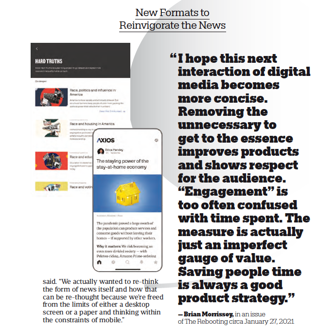 quickly,” Brian Morrissey writes in The Rebooting. “It’s no surprise that Axios was born in Washington, where most briefing documents are bullet pointheavy memos.”