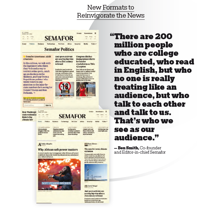 NEWS WEBSITE SEMAFOR, founded by former New York Times media critic Ben Smith and former CEO of Bloomberg Media Justin Smith, introduced the concept of “Semaform,” or what they call a redesign of “the atomic uni of written news, the article”.