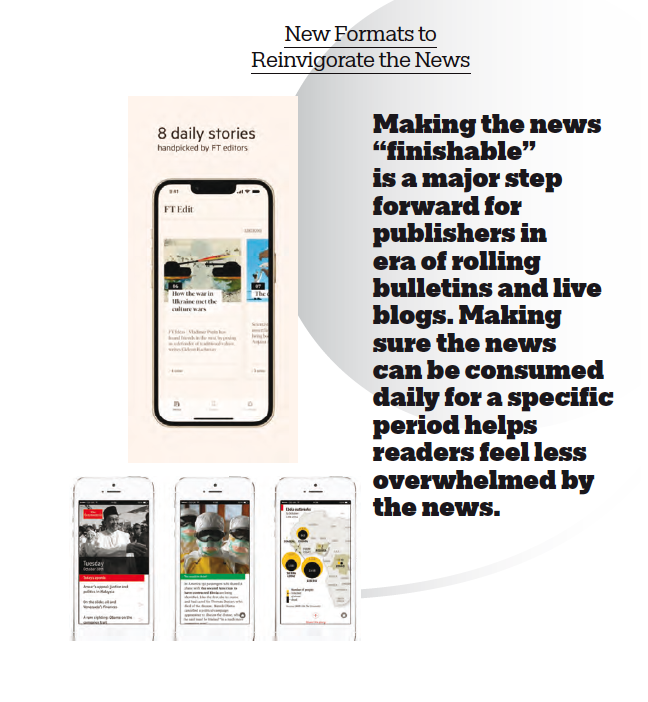A CLEAR THEME FROM OUR discussion so far on the formats being experimented with by Axios and Semafor is the idea of cutting through the clutter of a lot of digital news content that’s out there today, in a way that is attuned to audience needs. It’s little wonder then, that as a natural extension, the finite format is now becoming an increasingly popular product in news publishing. In an excellent piece for Twipe published earlier this year, Matthew Lynes writes in Twipe of five factors central to the functioning of finite