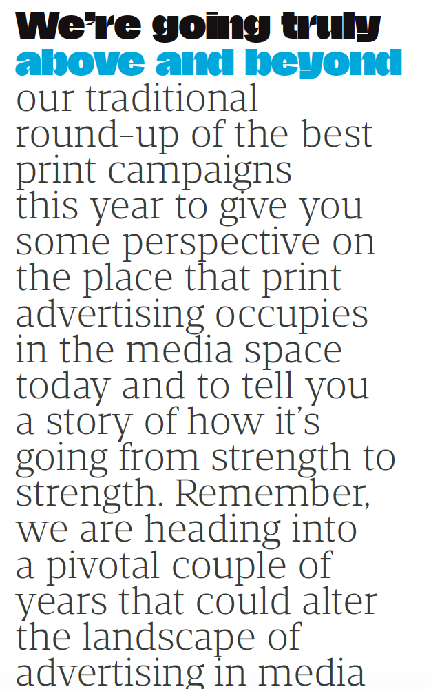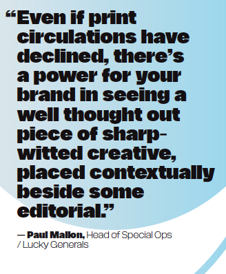 There is also evidence that digital clutter might be driving brands to consider, in a fresh way, the power of print. Recently, General Electric took over The New York Times’ print advertising for a day, amounting to 22 full-page colour ads as well as five partial pages. Omnicom-owned ad agency TBWA paid for its ‘Last Ad from